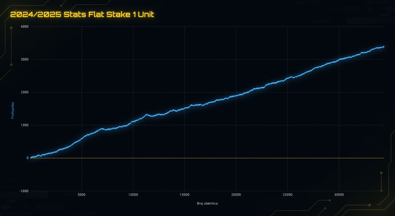 Ovde je grafikon kompletne dosadašnje statistike od juna 2024. godine kada je grupa krenula sa radom pa do današnjeg dana. Na njemu se može videti da je trend prilično standardan, neki meseci mogu biti malo gori, neki malo bolji, ali sve u svemu može se očekivati standardan profit. U proseku do sada po mesecu bude oko 3000 različitih utakmica.