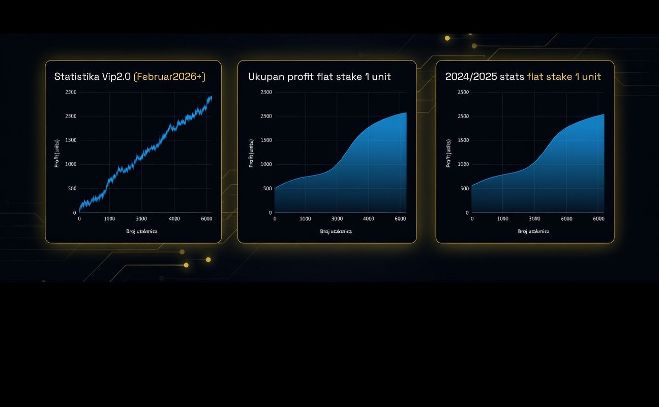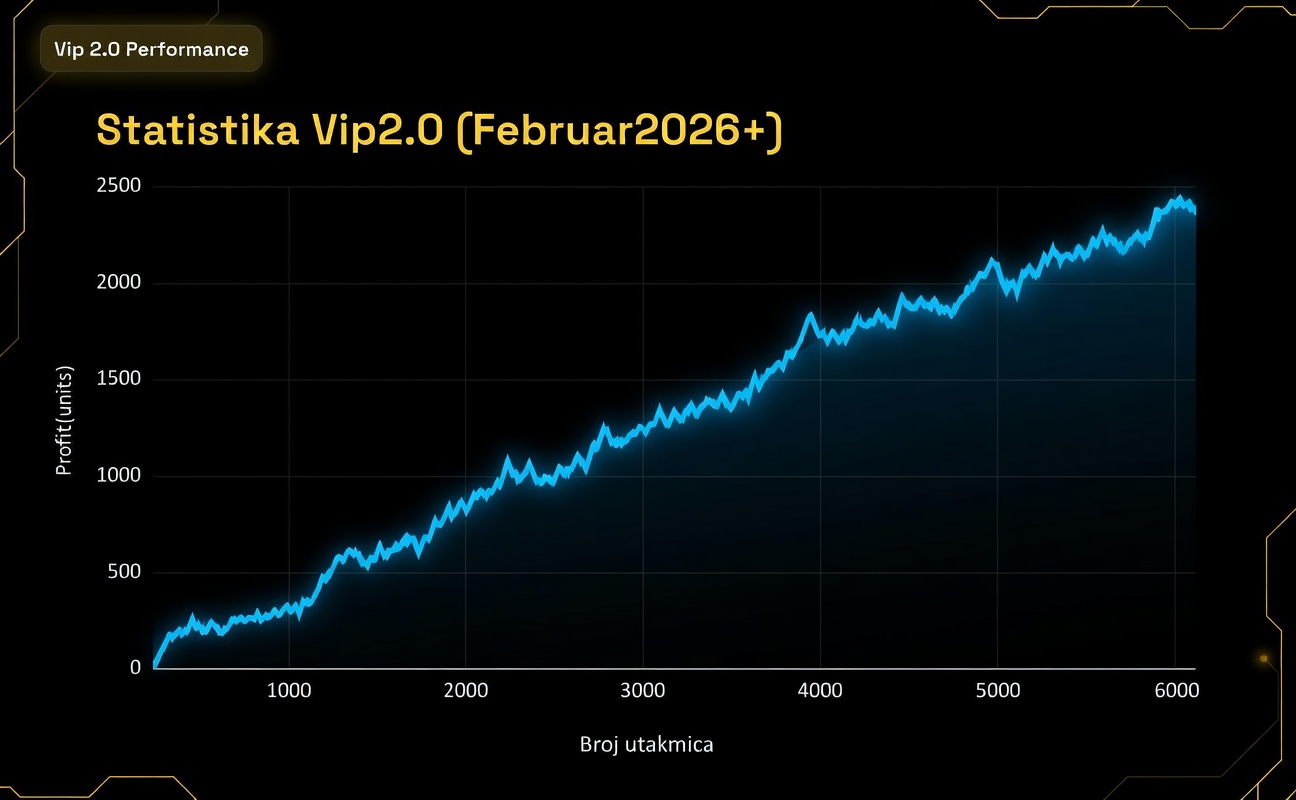 Od Februara 2026. godine smo uveli neke novine u našem servisu, pa su tako uz svaku utakmicu dopisani i ulozi kao i minimalne kvote po kojima treba da se odigra utakmica. Prosečan ulog po utakmici je malo manji od 4 unita pa u skladu sa tim treba da se posmatra i ovaj grafikon u odnosu na ostale na kojima je fiksan ulog po utakmici od 1 unit. Ulozi su napravljeni tako da je teoretski nemoguće da se izgubi bankroll od 500 unita.